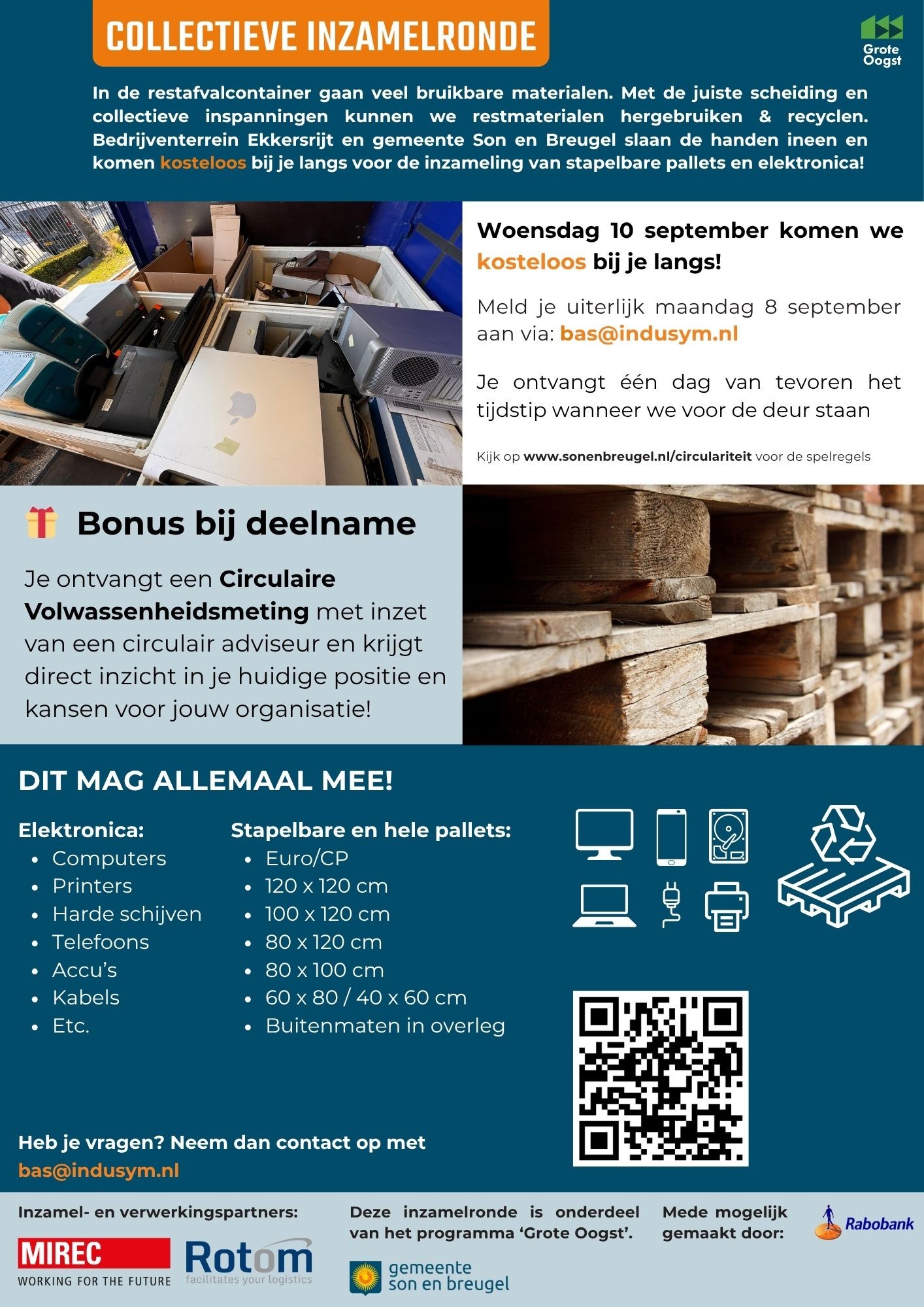 Bedrijventerrein Ekkersrijt zet samen met ondernemers, kennisinstellingen en overheden stappen richting een volledig circulaire toekomst. Binnen dit gezamenlijke traject staat het opbouwen van een circulair ecosysteem centraal, waarin hergebruik, samenwerking en innovatie leidend zijn. Het uiteindelijke doel is duidelijk: een volledig circulair bedrijventerrein in 2050. In dit kader worden er kosteloos collectieve ophaalrondes gefaciliteerd. Waar wacht je op?