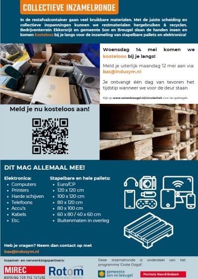 Op 14 mei vindt er een collectieve inzamelronde plaats. Stapelbare pallets en elektronica worden die dag kosteloos opgehaald.