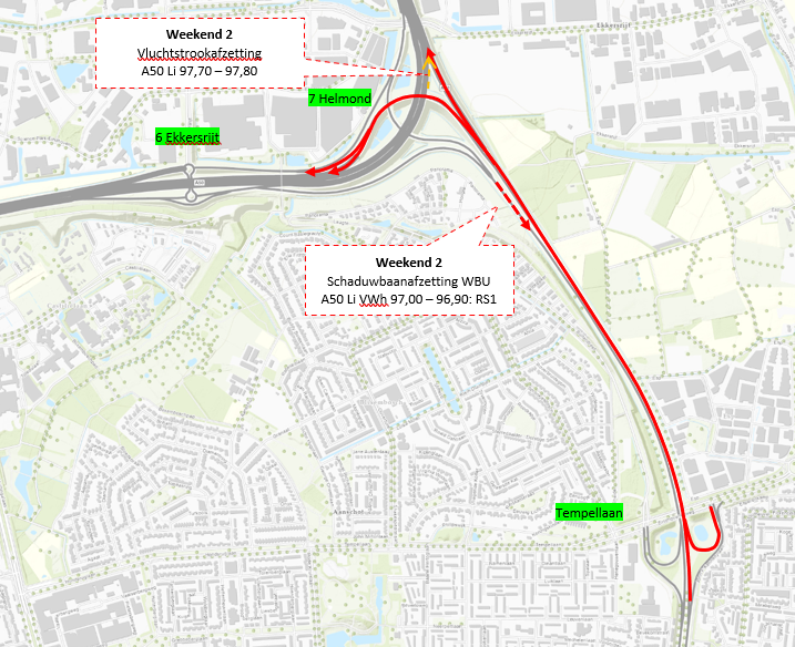 In het tweede afsluitingsweekend (week 18) worden aanvullende werkzaamheden uitgevoerd aan een installatie in de middenberm. Hierdoor wordt ook op de tegenovergestelde rijrichting (A50 richting Veghel) tijdelijk de linker rijstrook afgesloten.